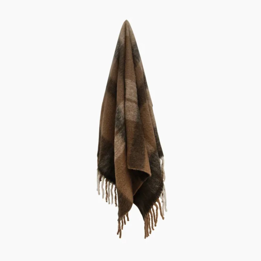 The Canopy Plaid Tassel Throw features a warm, neutral palette of brown, taupe, and beige tones with stylish plaid patterns and tassel accents. A cosy and versatile addition that effortlessly complements any space.