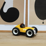 Play it or display it - you decide! Built to last, this charismatic kitty will look just as good on the shelf as he does at play. Super cool Karlos is a fast feline at the wheel of a Midi Egg Sunnysider from Playforever. The yellow body and white hubcaps give him a classic sporty style, while his silver goggles and ears popping up through his black helmet give him an air of cheeky cat cuteness! Ready to race on his quietly moving rubber wheels, Sunnysider Egg Roadster is solidly constructed from heavy duty plastic in a classic shape with a flawless finish.