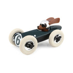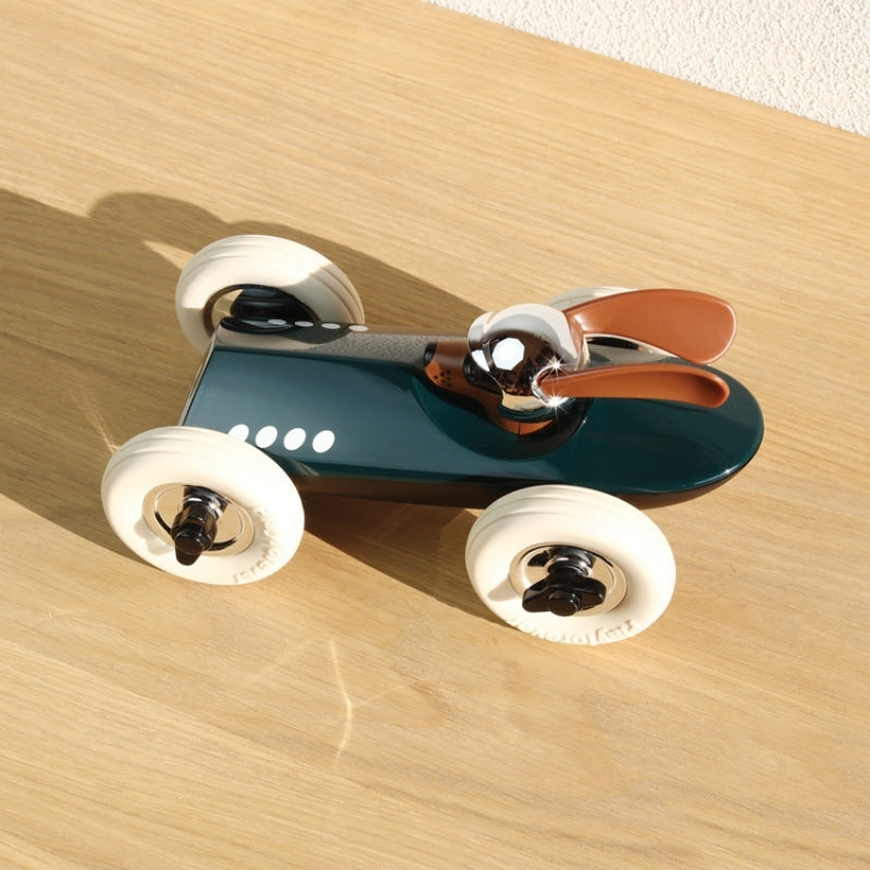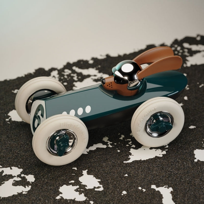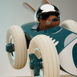 Weller Weller Weller what do we have here? Made from heavy duty plastic Playforever cars are solidly constructed in chic nostalgic styles and look just as good on the shelf as they do at play. Weller is no exception with his long ears that make him look as though he is flying past in his classic green racer. White rubber tyres with chrome rims that match his helmet complete his style. The original Rufus was specially designed in the UK for Hugo Boss and then expanded into it's own range under the Playforever banner. Grrrrreat fun is to to be had with the Rufus range of midi cars from Playforever.