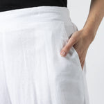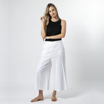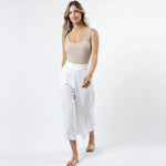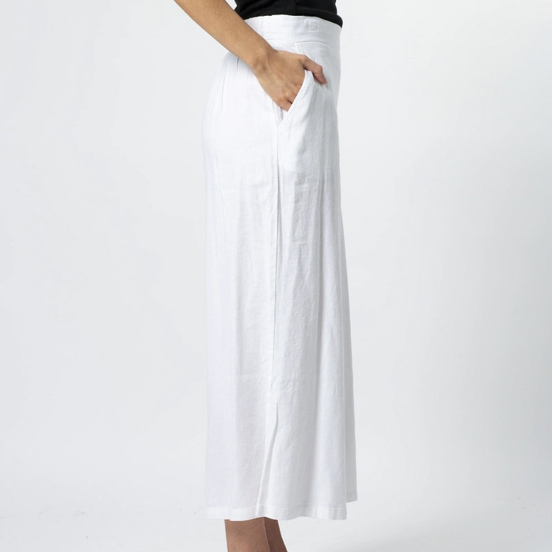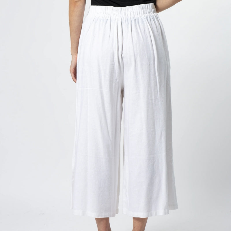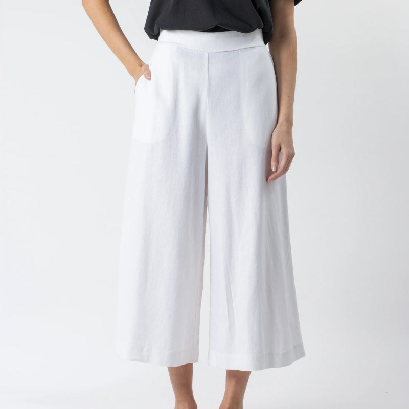 Cropped wide leg pant with flat front waistband, elasticated back waist and side seam pockets.