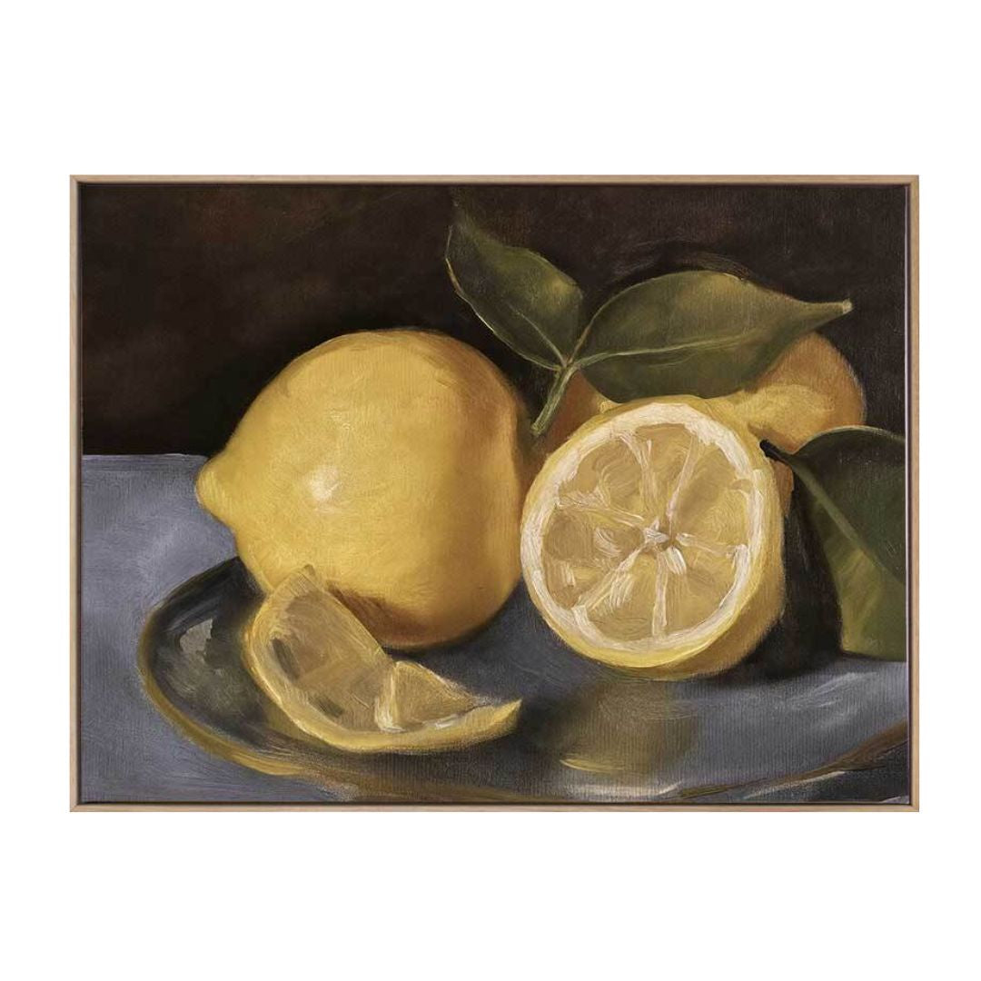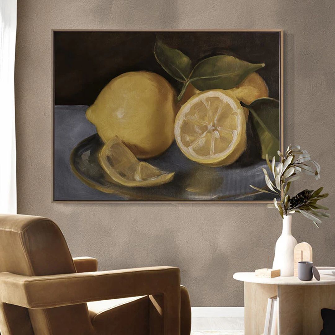 Still Life Lemons Canvas Art Print - This beautiful still life artwork by Darren Palmer evokes the charm of a vintage farmhouse. Painterly details of these lemons on a plate are brought to life with a soft palette of rich yellows and deep greens, ideal for enhancing many interior design styles in any living room, bedroom, or kitchen