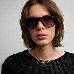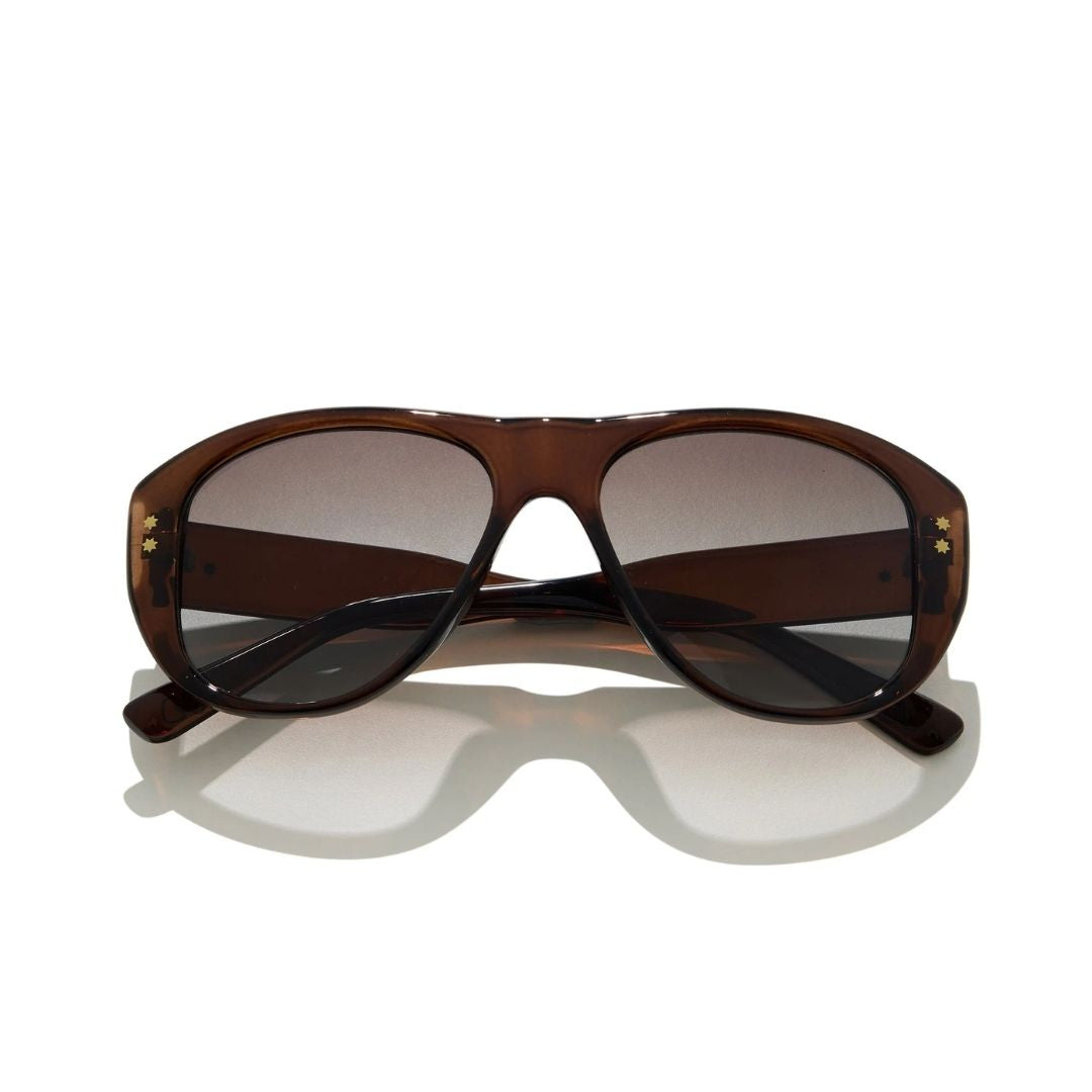 signature szade ; meet our dark brown austin, an oversized, 70's inspired aviator sunglass. referencing the classic pilot silhouette, austin offers maximum coverage, gradient brown lenses and old school glamour. worn best with your favourite pair of jeans and leather jacket.
