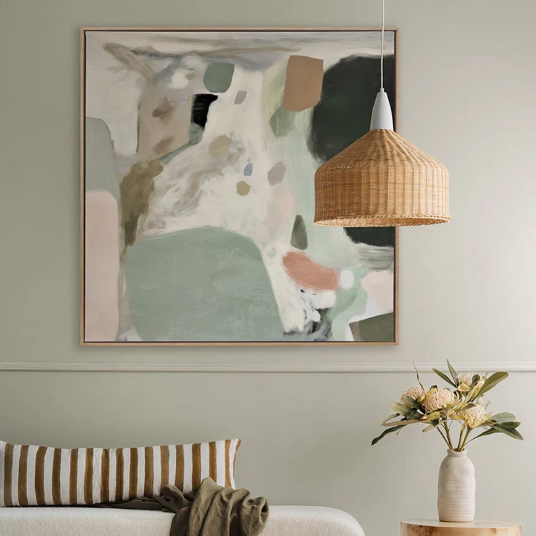 Traces of a Dream I Canvas Art Print - Soft, dreamlike hues merge in a landscape of fluid forms in this abstract art print. Gentle brushstrokes and organic shapes create a sense of movement, with versatile neutral shades of sage green, dark green, brown, grey, and blush. A delicate balance of depth and lightness, this piece brings a serene, meditative energy to any space.