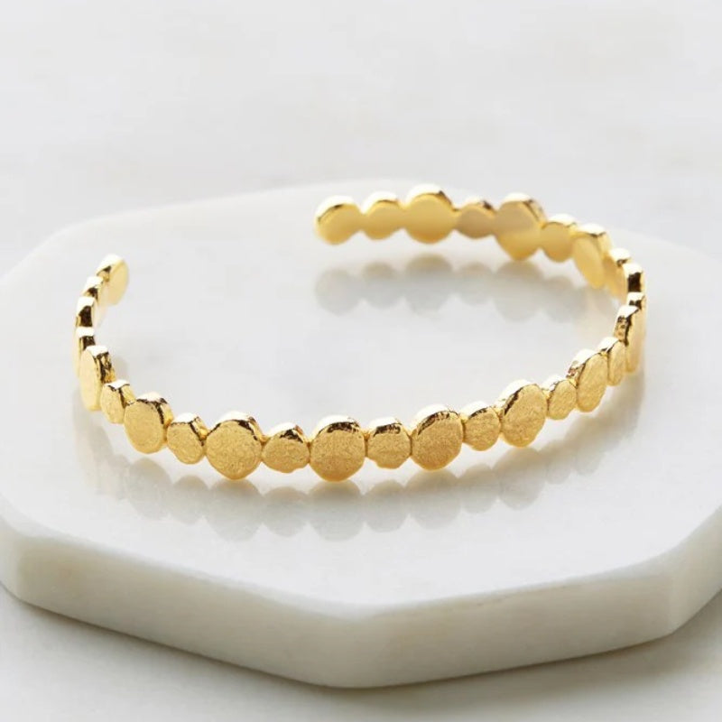 The Chloe Bracelet is a stunning cuff that combines bold elegance with intricate detail. Featuring a hammered disk design, this bracelet catches the light beautifully, showcasing its textured finish. Perfect for both day and night looks, the Chloe Bracelet makes a sophisticated statement, whether worn solo or paired with the Chloe Necklace, Ring and Earrings to complete the collection. Its timeless design and luxurious feel make it a must-have addition to any jewellery collection.