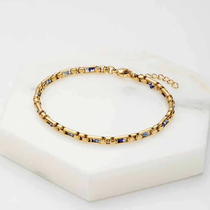 Elevate your wrist with the Luna Bracelet, a delicate chain bracelet adorned with Navy beads interspersed between its links. This understated yet elegant bracelet adds a subtle pop of colour and texture to your ensemble, effortlessly blending sophistication with everyday charm. Perfect for layering or wearing solo, the Luna Bracelet is versatile and timeless, making it an essential addition to your jewellery collection.