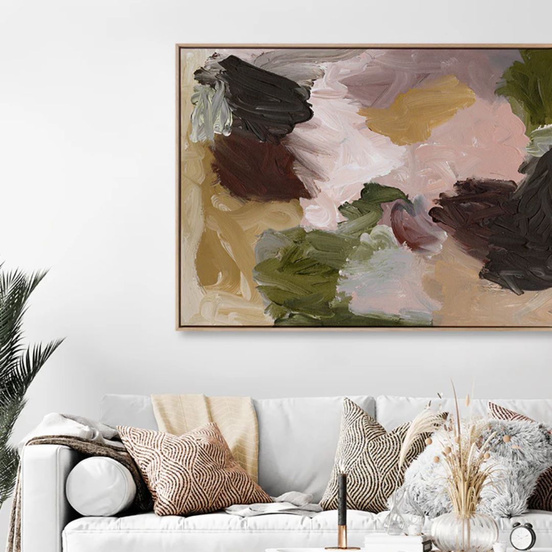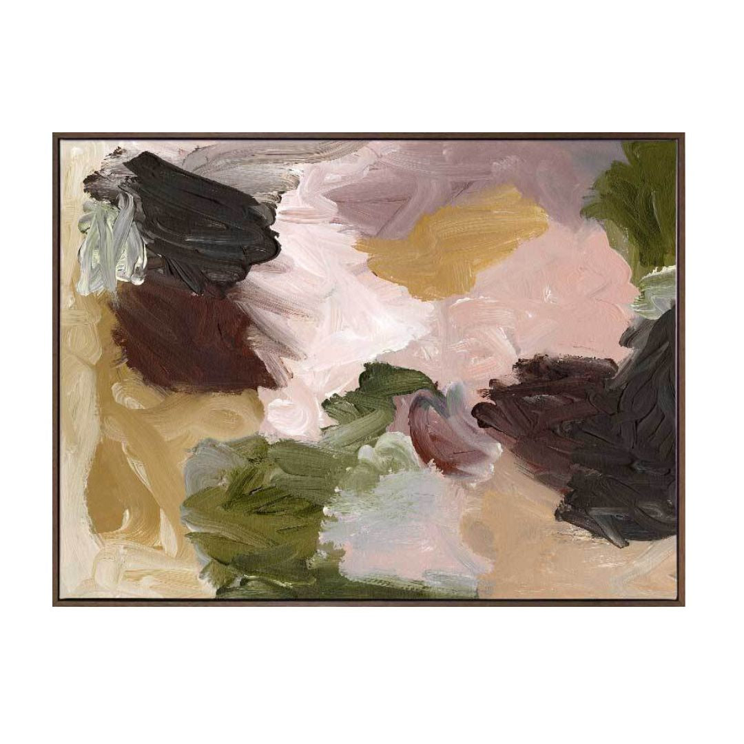 Cobblestone Canvas Art Print - Warm and grounded, this textural abstract artwork features overlapping swatches and scribbles of paint. The colour palette is earthy, focusing on neutral clay tones balanced by deep, dark green, mustard and burgundy.
