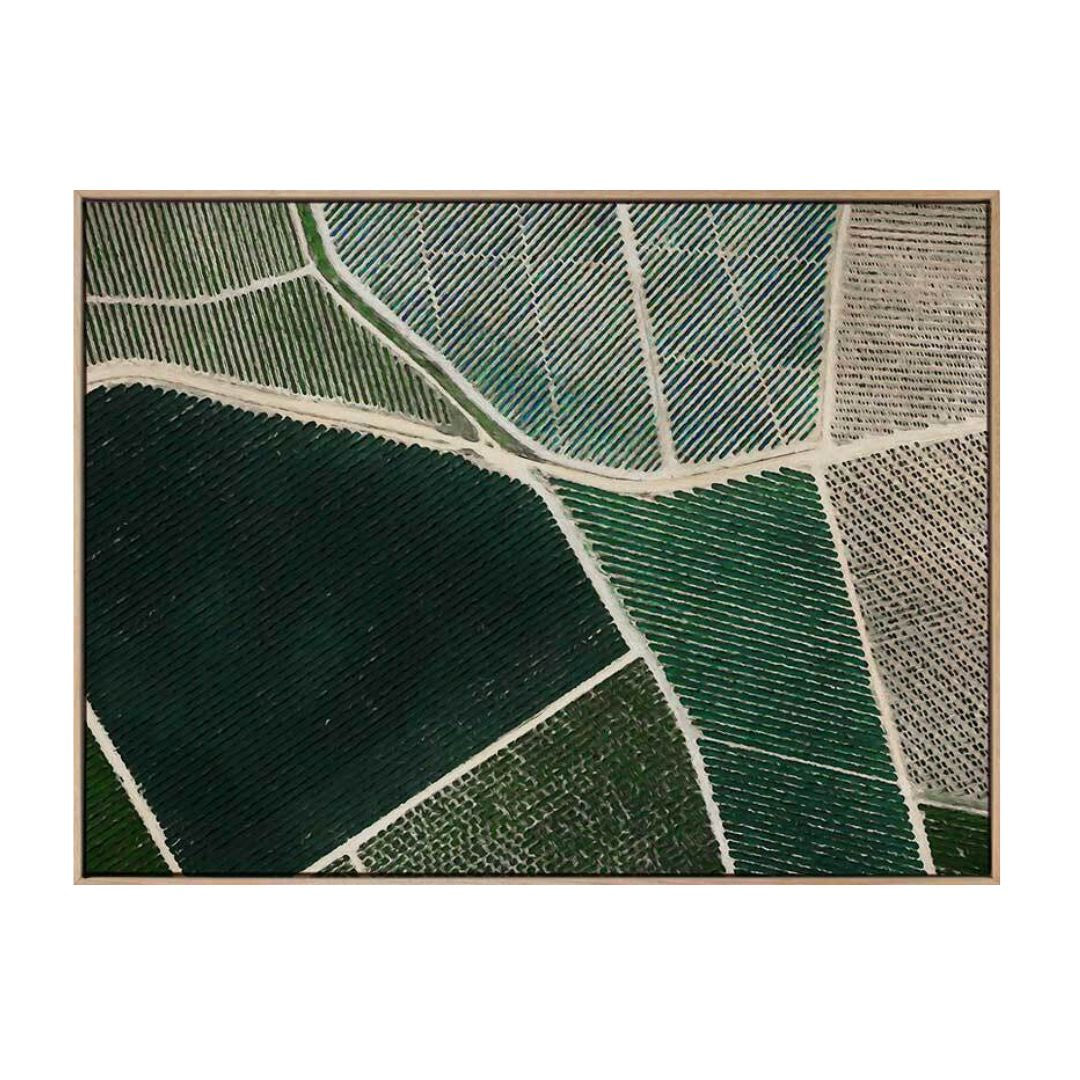 Field of Dreams - An aerial artwork featuring a patchwork of crop fields in rich green tones. Introducing the latest addition to our Urban Road x Shaynna Blaze collaboration - IN PLANE VIEW Of the collection, Shaynna says, "It's inspired by my years of travel around Australia and overseas, staring out of a plane window and taking in the different shapes, patterns and palettes of the spaces below." A breathtaking showcase of aerial landscapes, capturing the rich colours, beautiful intricacies, and flowing forms of nature.