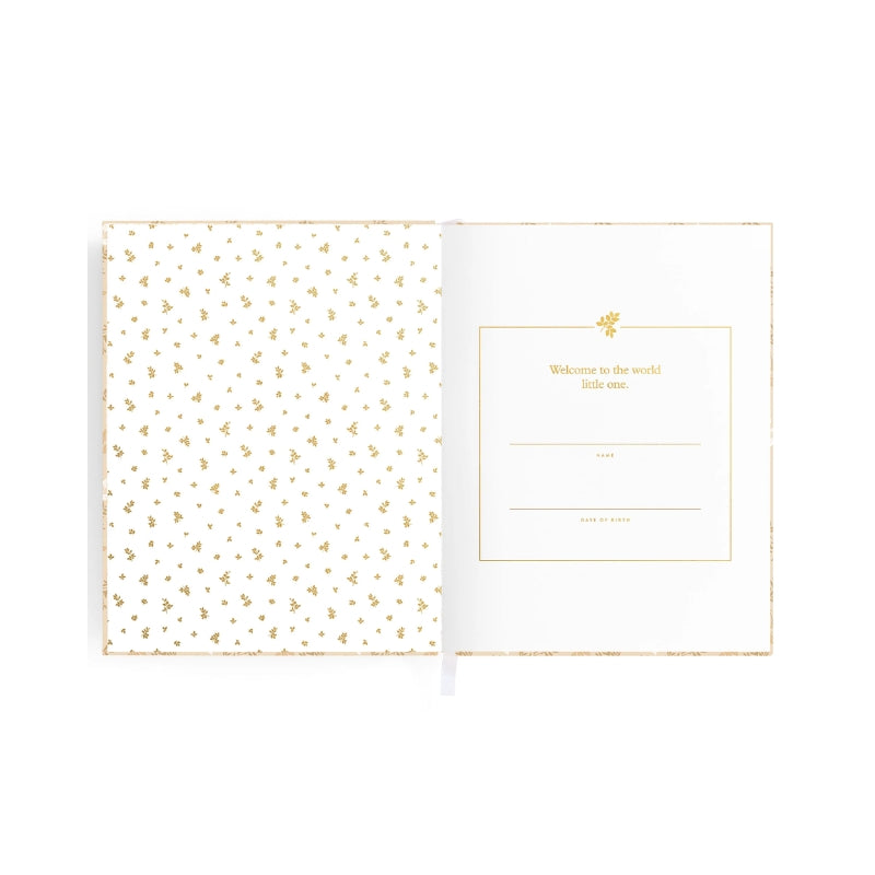 220 x 280 mm (15mm spine) / 8.6 x 11 inches (0.59 inch spine). Gold foil stamped printed linen cover. White grosgrain ribbon. 2mm foil stamped hard cover, lay-flat binding. Gold foil end pages and premium 115gsm FCS-certified acid-free paper. Packaged in a cello sleeve with gold foil bellyband. Designed in Australia, printed in China.