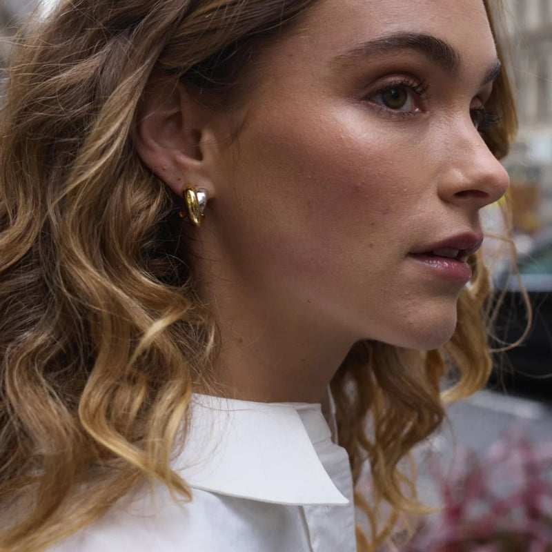 The Freya Hoop blends gold and silver tones in a bold, sculptural design that feels both timeless and modern. Its curved silhouette makes a statement while remaining versatile enough for everyday wear. Pair with theFreya Ringor layer alongside simple studs for a perfectly balanced mixed-metal look.