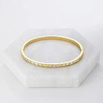 This elegant gold-toned bracelet features a sleek, solid band adorned with a row of sparkling baguette-cut stones, adding a touch of refined glamour. Ideal for elevating both everyday and formal looks.