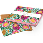Bushland Botanicals is a vibrant placemat showcasing striking proteas, golden banksias, and other native Australian flora on a soft blue base. Perfect for dining while appreciating the beauty of bushland blooms!