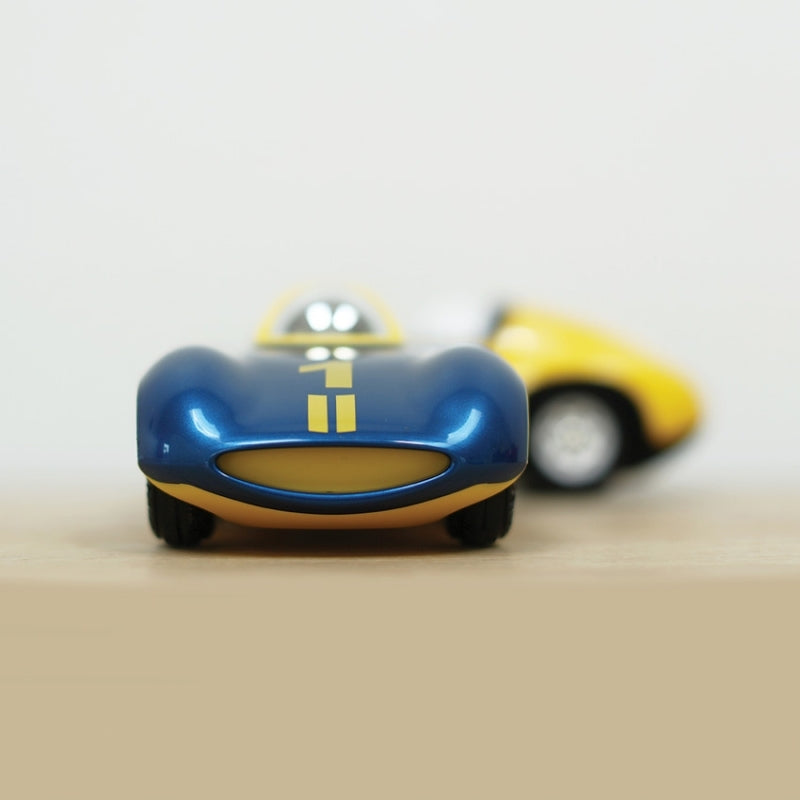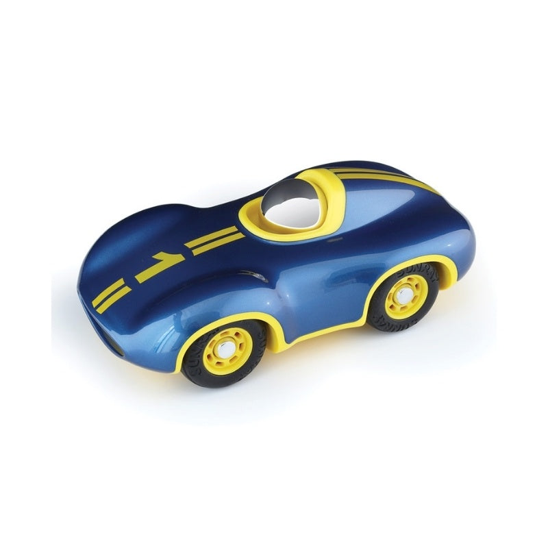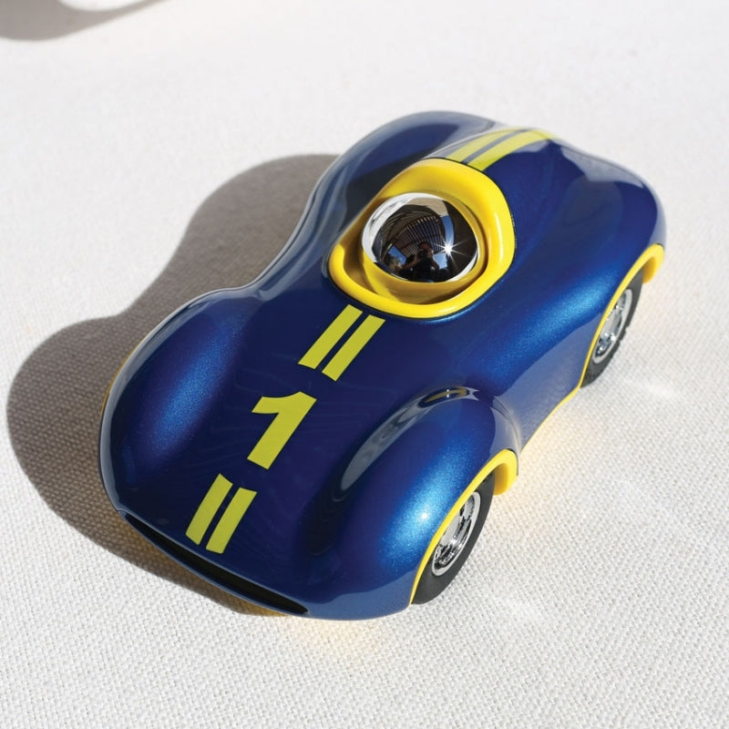 The Mini Boy is a striking metallic blue with yellow trim and chrome helmet and wheelcaps. Designed in the UK the Playforever range is made from heavy duty plastic and moving rubber wheels for easy handling. With sleek lines and gorgeous curves you can put it on the shelf for decoration or use it for everyday play!