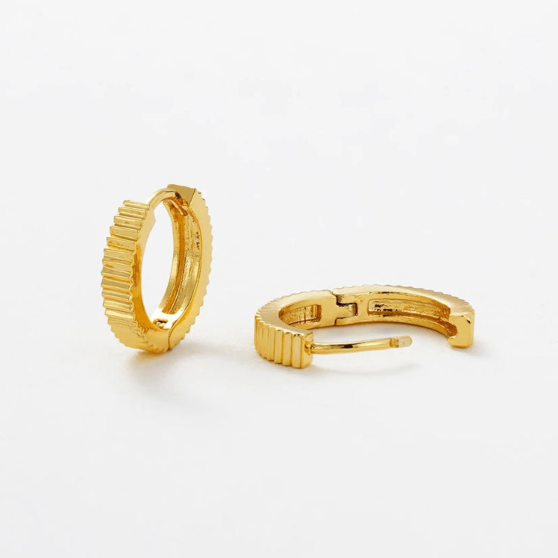 A modern twist on a classic hoop, the Willow Huggie features a refined ribbed texture and a high-shine gold finish. Effortlessly versatile and perfect for everyday wear, this piece adds subtle edge and sophistication to any ear stack.