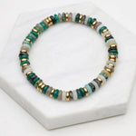 A bold and elegant statement piece, featuring a gradient of olive green-toned beads beautifully contrasted with gold beads. This striking combination creates a rich, sophisticated look, perfect for adding warmth and depth to any jewellery collection. Made Nickel Free Hypoallergenic Stainless steel metal 18k Gold Plated Size: elastic 17.5cm Waterproof - Ocean/Shower/Pool Proof