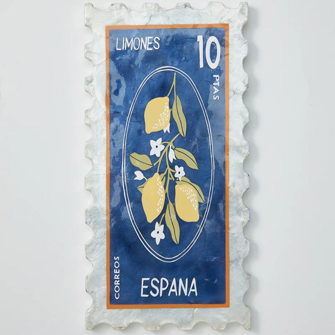 Our fun Fiesta Stamps Wall Art series, where the flavours of Spain come to life with hand-drawn and hand-painted designs on authentic capiz shell from the Philippines. These original artworks showcase the essence of Spanish culture with elements like fruit, oysters, and parrots arranged in stamp-like designs. Group together in a series or add to a niche wall or french hang.