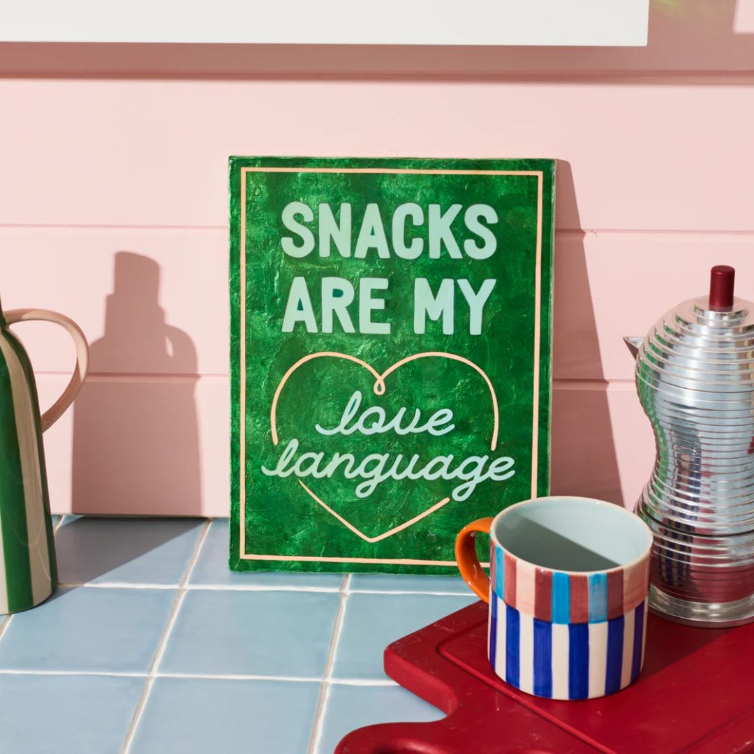 Snacks are a love language, and this snack quote tile makes it official. Crafted from glossy capiz shell and painted in rich green with a pretty pink heart, it's a cheeky addition to your kitchen, pantry or snack zone Makes a super fun gift.