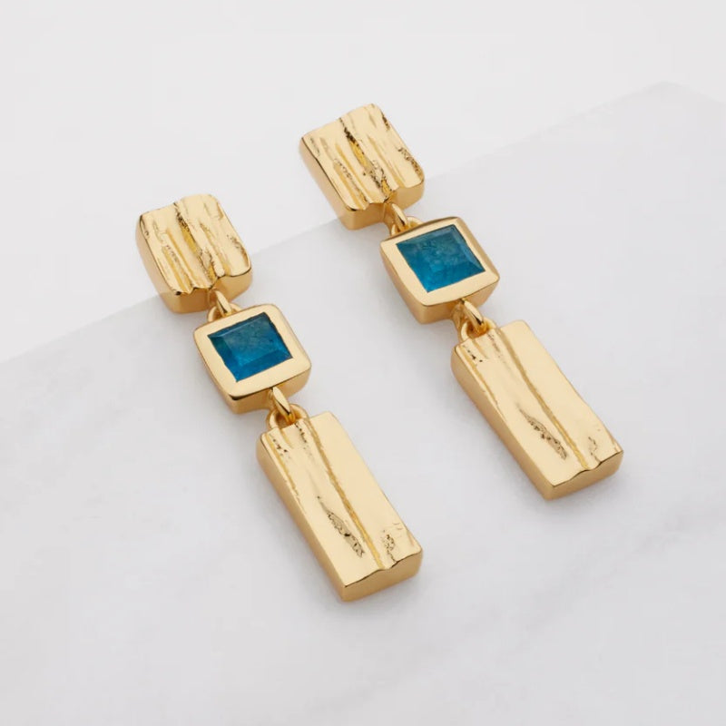 These bold statement earrings feature textured gold-tone bars paired with a striking blue black jade square gemstone at the center. With their geometric design and modern edge, they’re perfect for elevating any outfit.
