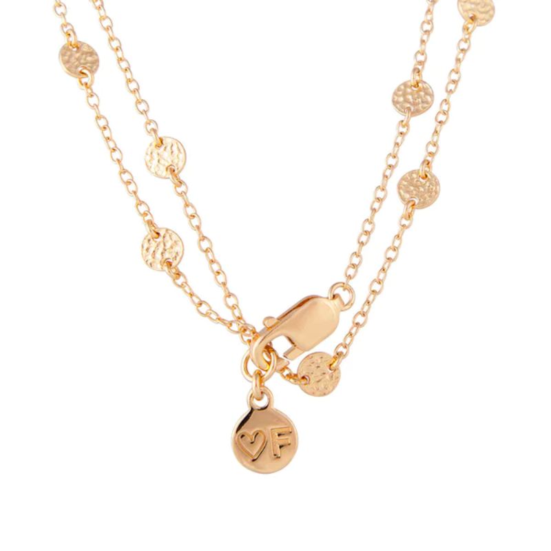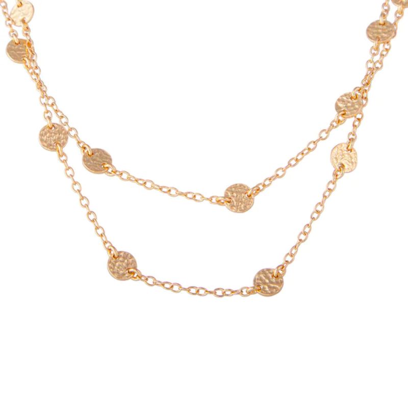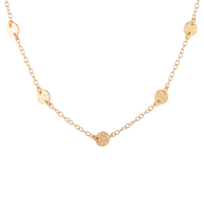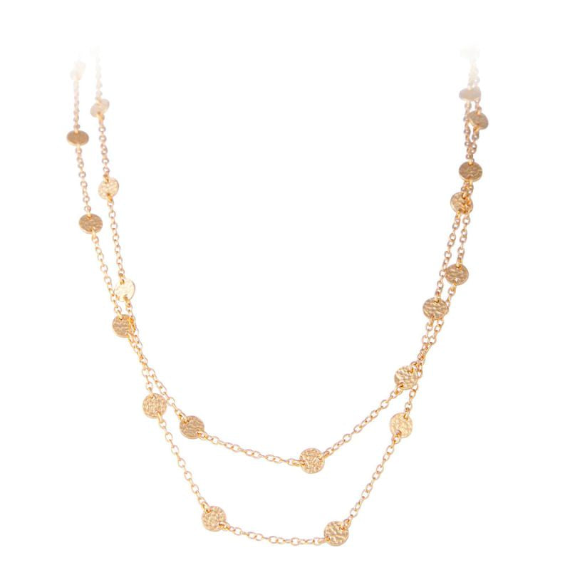 This charm necklace comprises mini hand beaten round discs. Designed to be worn long or doubled over for a shorter length,  this necklace is versatile and stylish.