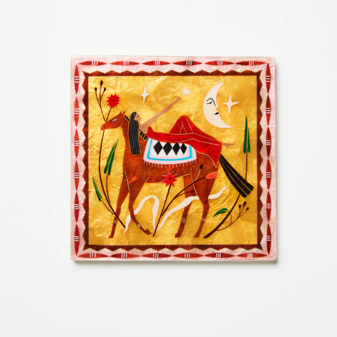 A dreamy tale in tile form. The Fable Horseback Pink Square features a hand-painted rider under the wistful moon, framed in desert pinks and gold. This square capiz wall tile feels like a moment from a storybook, captured mid-gallop.
