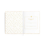 220 x 280 mm (15mm spine) / 8.6 x 11 inches (0.59 inch spine). Gold foil stamped printed linen cover. White grosgrain ribbon. 2mm foil stamped hard cover, lay-flat binding. Gold foil end pages and premium 115gsm FCS-certified acid-free paper. Packaged in a cello sleeve with gold foil bellyband. Designed in Australia, printed in China.