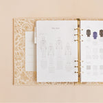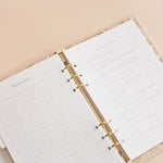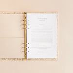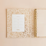 - Champagne elastic and gold ring binder with gold foiled tabbed divider pages