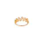 This ring features a band of crystal encrusted palm leaves set in sterling silver 18k gold plate. This ring is a contemporary classic that looks great solo or back with your stack!