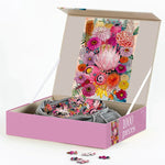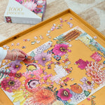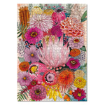 1000 Piece Jigsaw Puzzle, “Jade” was named after one of the artist's good friends. Like her friend, it is bubbly and bright and a pretty, vibrant artwork featuring protea, banksia, zinnia, ranunculus, cosmos and dahlia, with a watery peach and teal background.