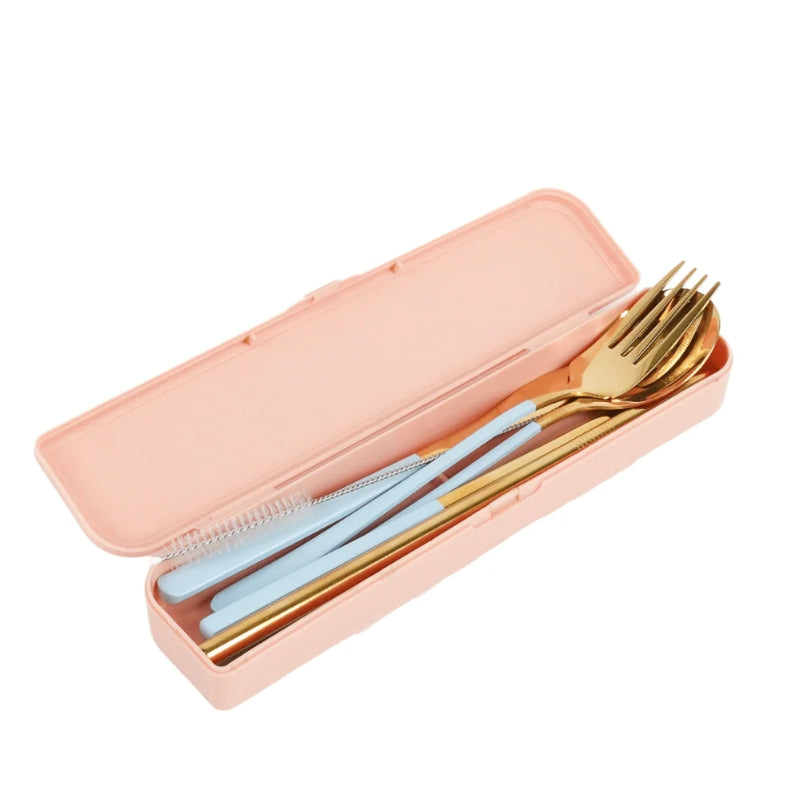 Featuring a knife, spoon, fork, chopsticks, medium straw (thick smoothie lovers - we got you) and straw cleaner all housed in a beautiful plastic container. The cutlery is made from high quality stainless steel - no blunt edges to be found! The container, which is made from recycled plastic and can be recycled at the end of its life, keeps your set together so you can easily throw it in your handbag. Dirty cutlery is contained - no grubby fabric pouches here - and everything (including the container) can be thrown in the dishwasher for an easy clean.