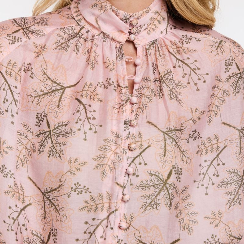 A soft, feminine blouse featuring a delicate botanical print on a blush base. Designed with a ruffled high neckline, subtle tie detail, and billowy sleeves with gathered cuffs, it drapes beautifully for an effortlessly elegant look. Perfect for pairing with tailored pants or skirts for a polished finish.