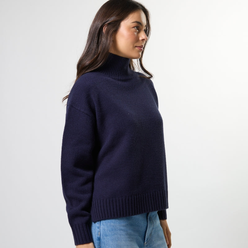 Relaxed fit high neck knit with fashioning details around armholes and rib trims on neck, cuffs and hemline. Side splits at hem.85% ACRYLIC / 15% WOOL