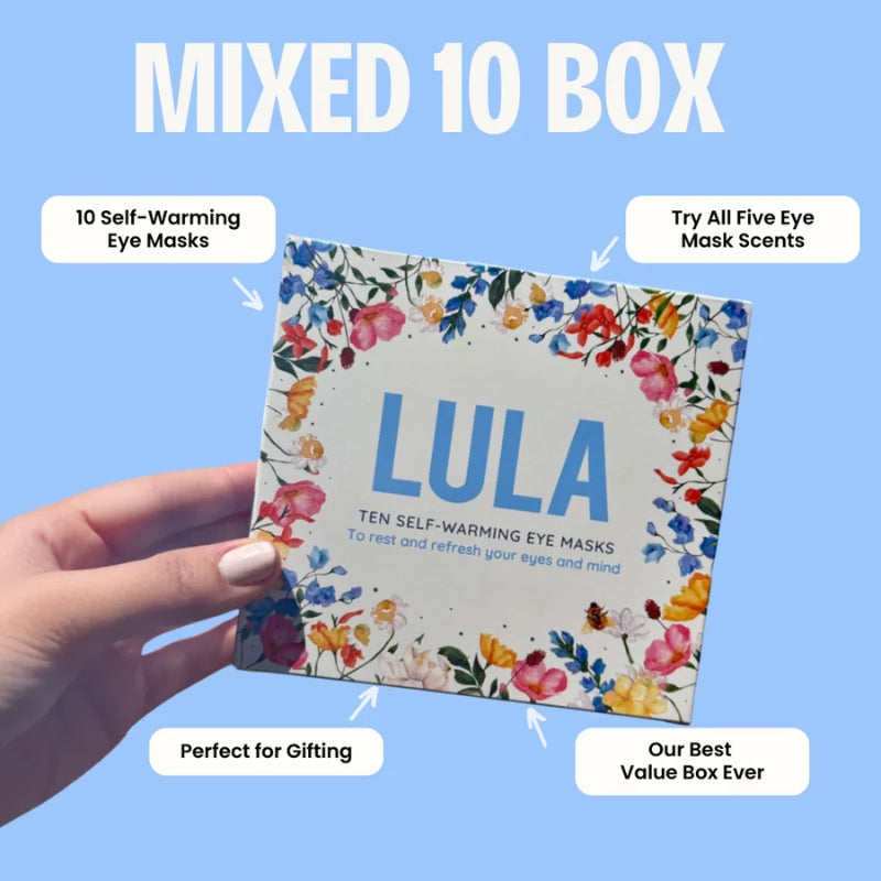 The new Mixed Box of 10 Self-Warming Eye Masks includes two of every Lula Eye Mask - 2 x Vanilla, 2 x Lavender, 2 x Rose, 2 x Jasmine and 2 x Unscented.