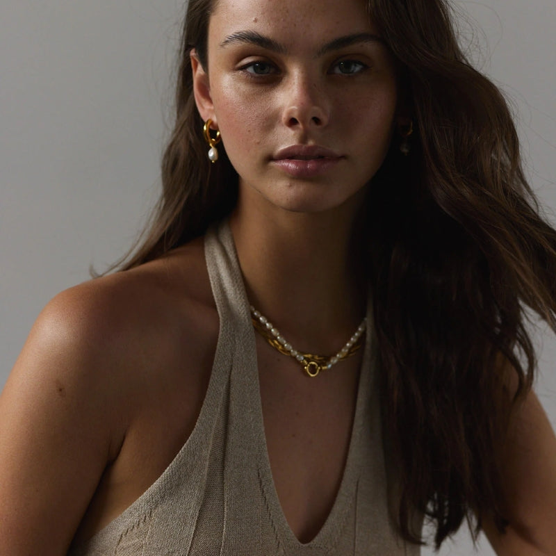 Introducing the Leah necklace, a radiant symbol of elegance and refinement. Crafted with exquisite 18k gold plating and adorned with a lustrous freshwater pearl, this necklace exudes timeless sophistication.