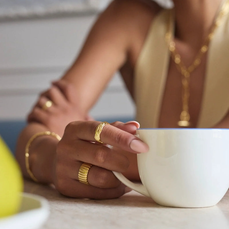 The Alexandra Ring is a bold yet elegant piece, crafted with a textured gold finish that gives it an organic, sculptural feel. Its layered design adds depth and dimension, making it the perfect statement ring to wear solo or stack with finer bands. A timeless addition to the Alexandra collection, it embodies both strength and refined style.