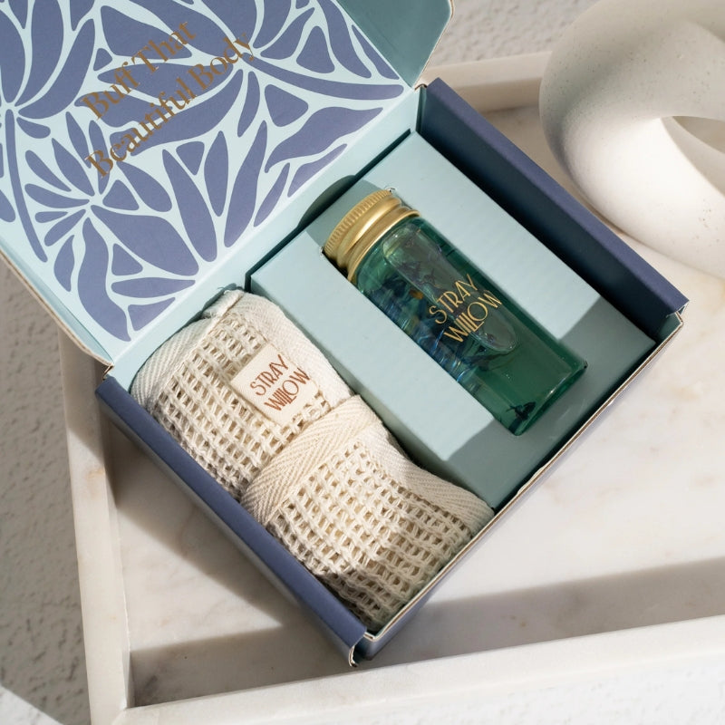 A natural self-care gift set with body oil and exfoliating cloth for glowing skin