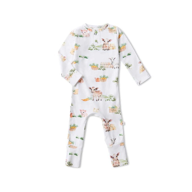 This design includes a long, hidden zipper from ankle to ankle, inside the leg. This means bub’s body can stay warm while their nappy is being changed, with simple, easy access. It also means these growsuits are as easy as a T Shirt to put on bub! Scrunch them up from the bottom and pop them on over their head.
