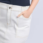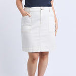 Comfort plus denim skirt for all day wear. The Atlas Denim Skirt features a comfortable elastic waist with front patch pockets and all the Elm denim bells & whistles.