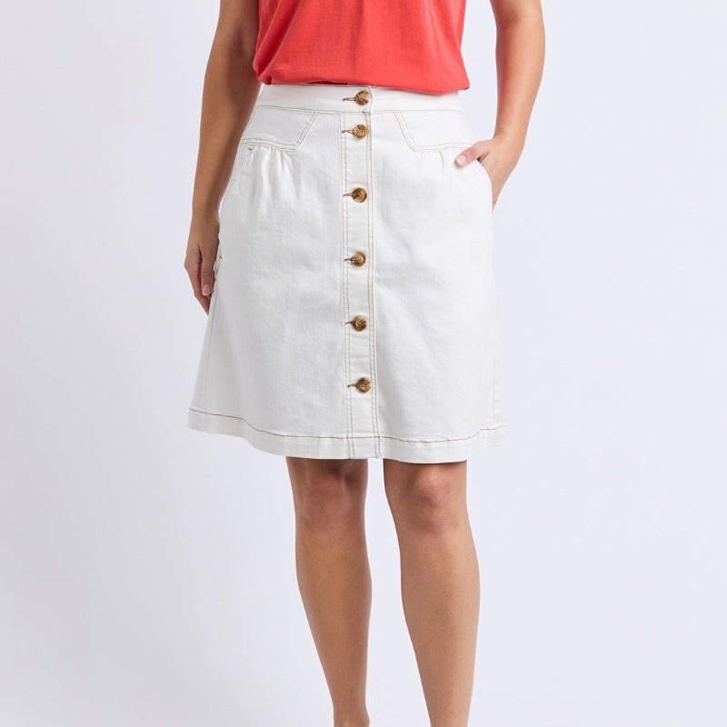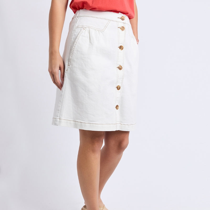 A little bit retro. A lot of cute. This A-Line denim button front skirt is a must-have this season. Featuring side pockets, front tuck detail and an elasticated back, this skirt looks great with strappy sandals and your favourite tee!