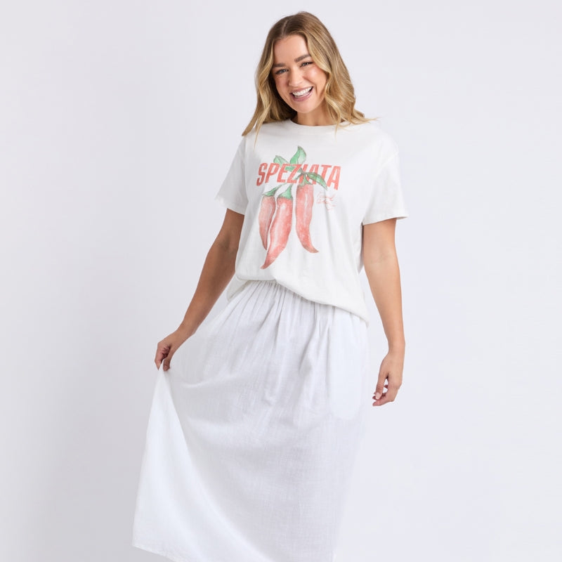 Ready to turn up the heat on your summer style? The Speziata Tee by Foxwood is here to spice things up. Crafted from breathable cotton with a laid-back relaxed fit and timeless round neckline, this vintage white beauty with exlusive print will keep you cool while looking effortlessly chic.