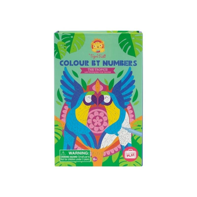 A fresh twist on a colouring classic. Designed to challenge older kids, images in this set are meant to puzzle and surprise. Select a favourite tropical picture and simply colour in the corresponding numbers with the correct coloured marker and watch the drawing come to life Start by colouring in one number at a time, the picture you are creating might not be clear at first! But slowly, with patience and focus the lines become a colourful masterpiece.