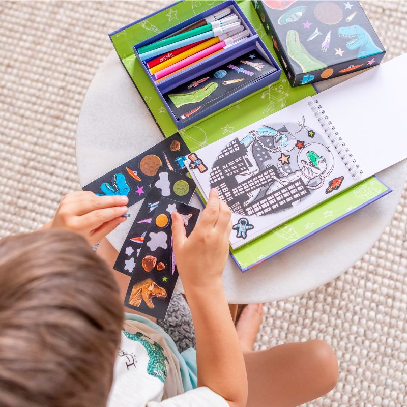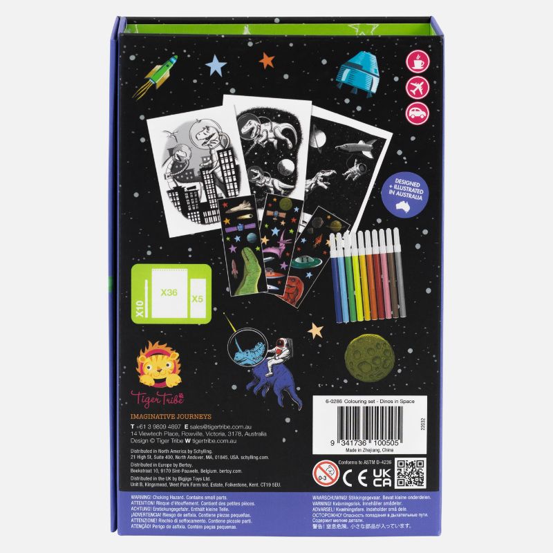 ●    Classic Tiger Tribe colouring set featuring fun dinosaurs in space illustrations