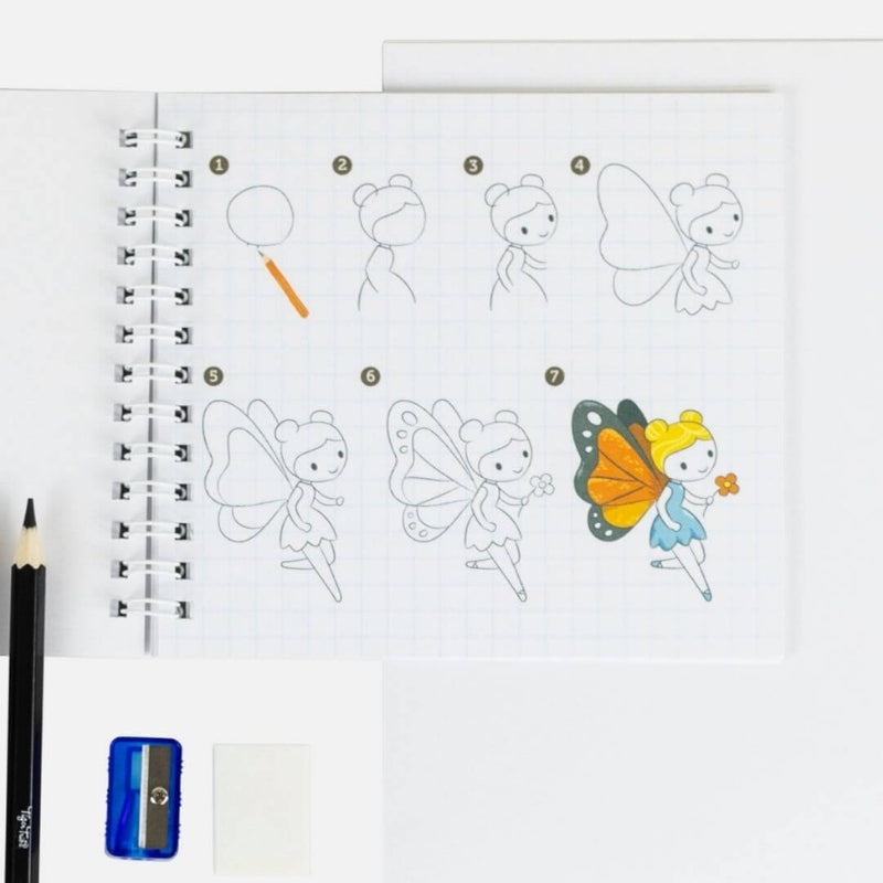 Each set contains 24x page drawing guide with visual instructions, 36x page gridded sketch pad, 9 coloured pencils, 1x HB pencil, sharpener and eraser