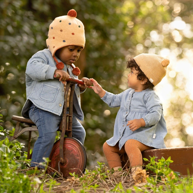 Toshi Earmuff Storytime is crafted from the finest quality certified 100% organic cotton yarn. Organic certification ensures the beanie is gentle on heads, as well as our precious environment. The beautifully textured melange yarn brings an element of refinement to the beanie. This beanie features ear flaps for cosy and nurturing protection from the elements. Pom poms introduce a cute and playful look. The baby beanie Earmuff Storytime is fully lined for enhanced comfort and greater warmth during our cooler months.