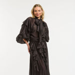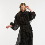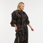 A romantic black blouse featuring soft ruffle detailing, a delicate tie neck, and billowy sleeves. Effortlessly elegant with a touch of vintage-inspired charm.