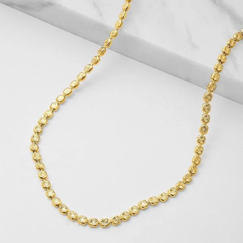 A versatile and stunning accessory that adds a touch of elegance to your neckline. This necklace features a disk pendant with delicate engravings, creating a beautiful and intricate design. Its disk detail adds a modern and stylish element to the piece, while the necklace's length makes it the perfect layering companion. Whether worn alone for a minimalistic look or layered with other necklaces for a fashionable statement, the Belle Necklace effortlessly enhances your style.