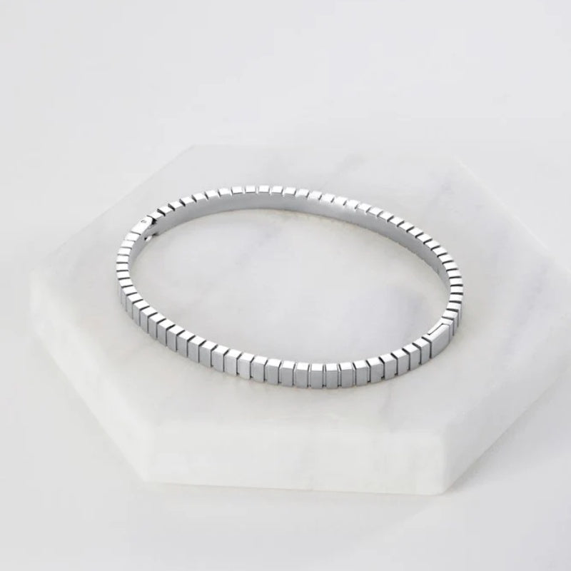 This is a sleek and modern silver bracelet featuring a segmented design that adds a touch of sophistication and contemporary style. Perfect for stacking or wearing solo for a minimalist statement.