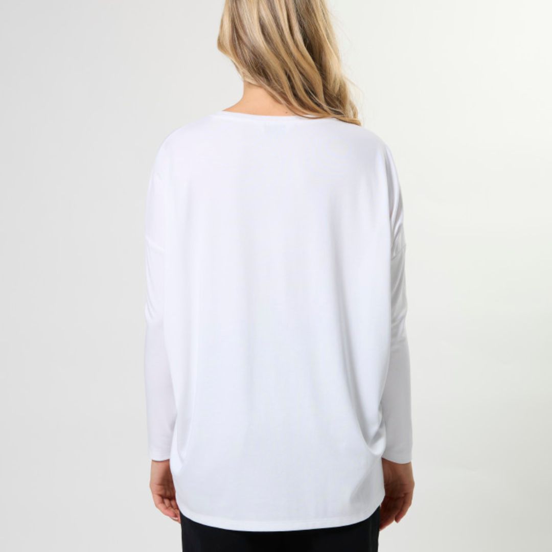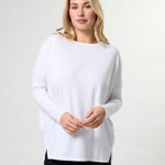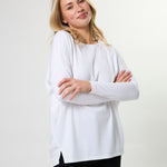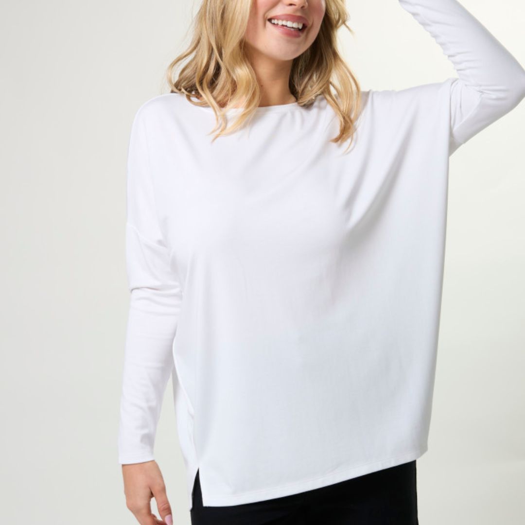 Relaxed fit jersey knit boatneck with dropped shoulder, fitted lower sleeve and side hem splits.