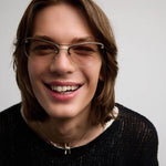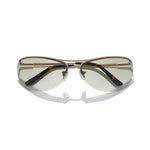 signature szade ; meet slim, a sporty, 90s inspired metal oval sunglass with a slightly wrapped profile. this semi rimless sunglass is a chic, sleek approach to sport style and is the ultimate festival frame. in champagne colourway slim will take you from coffee run to the club.