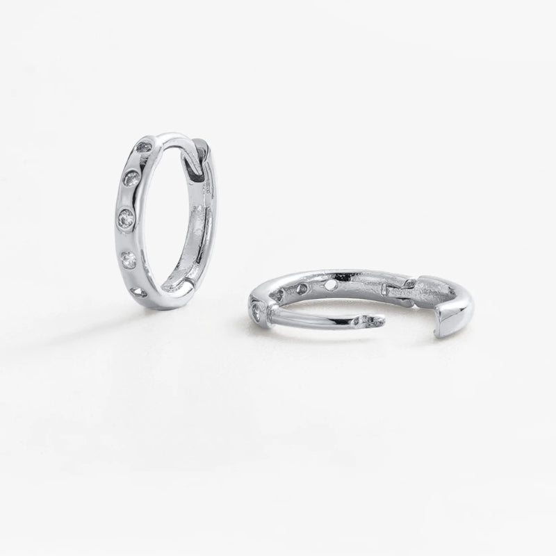 The Talia Huggie is a refined everyday hoop featuring delicate crystal accents set into a sleek gold silhouette. Designed to sit close to the ear, this piece delivers subtle sparkle while maintaining a clean, minimal finish.